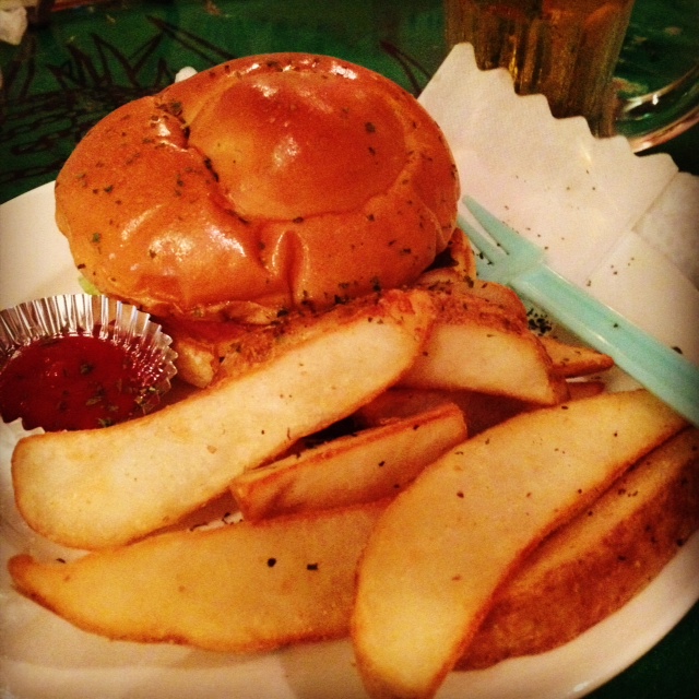 空腹につきハンバーガーを。さるまるさんはゴーヤピザ、いこまくんはタコライス。ビール美味。