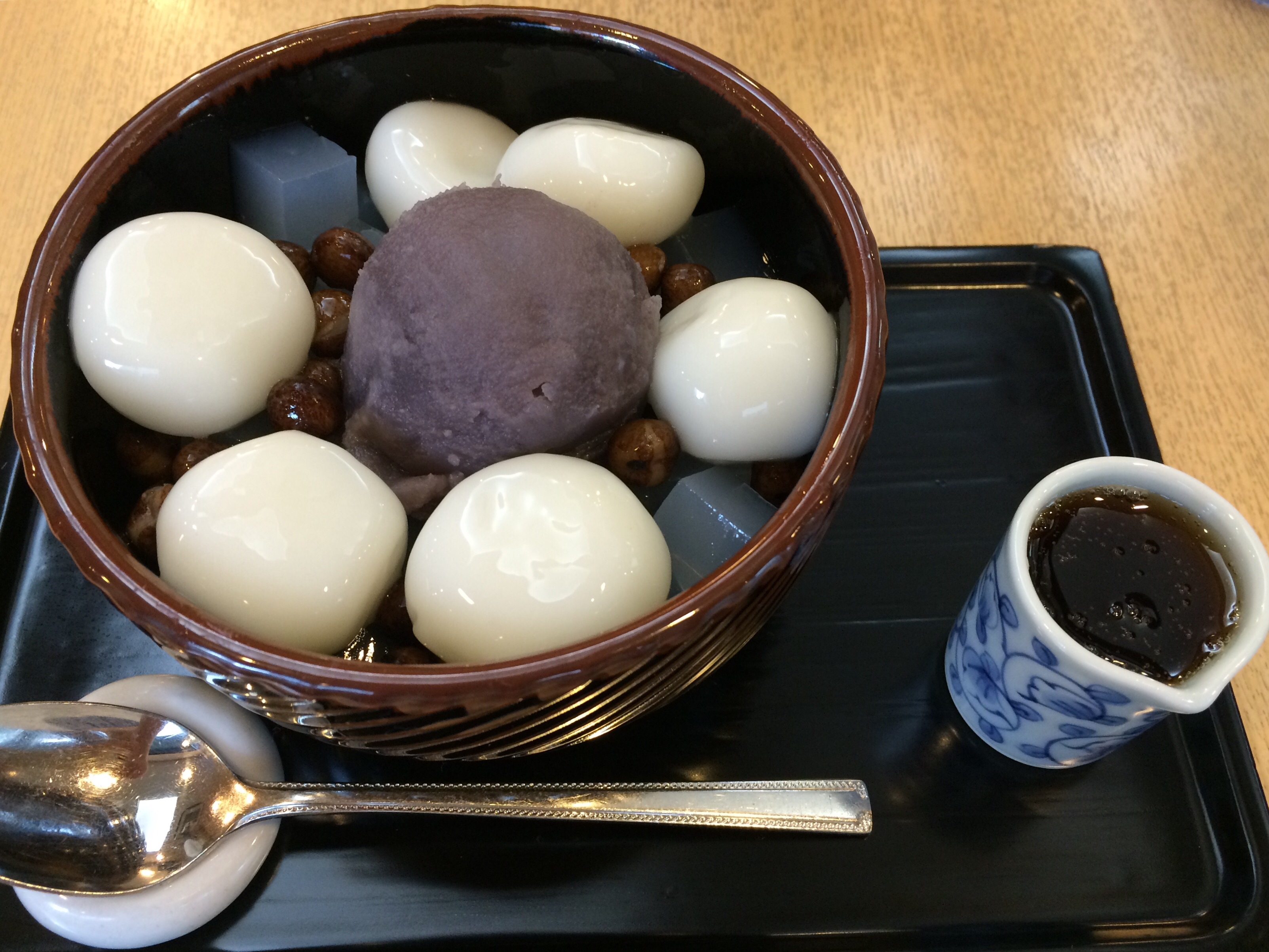 夜の異業詩交流句会エフーディの会まで、少し時間があったので、神楽坂の紀の善へ。もう夏だものね、ちうことで、白玉あんみつをば。